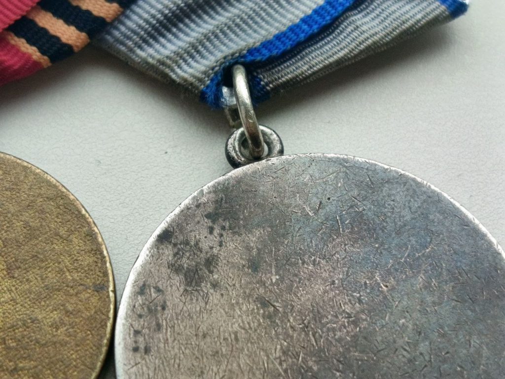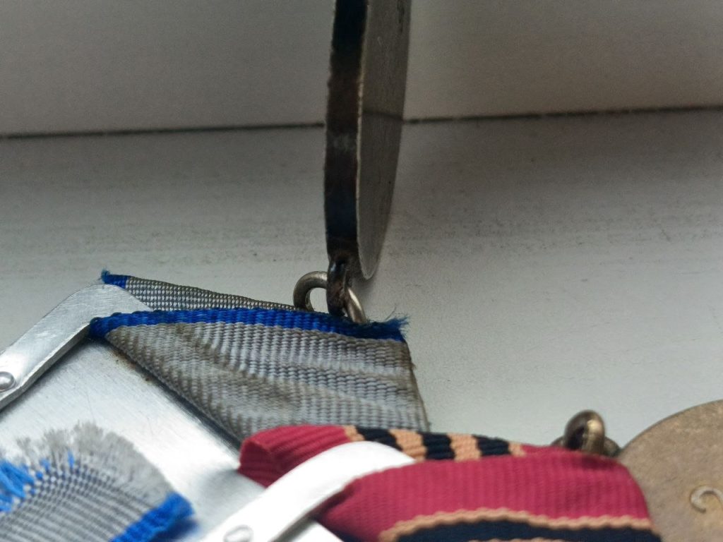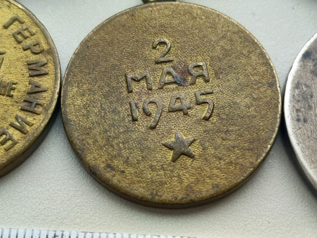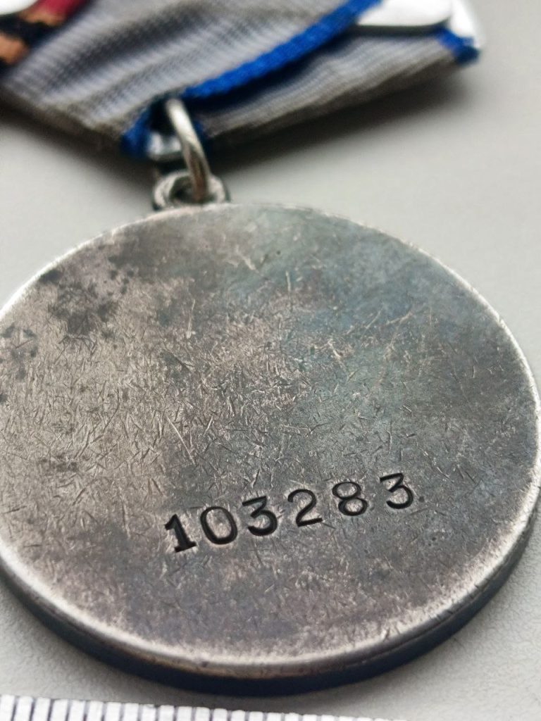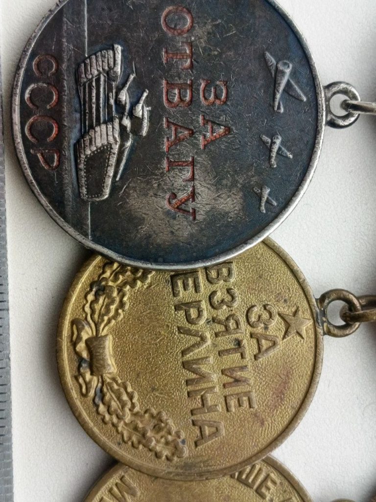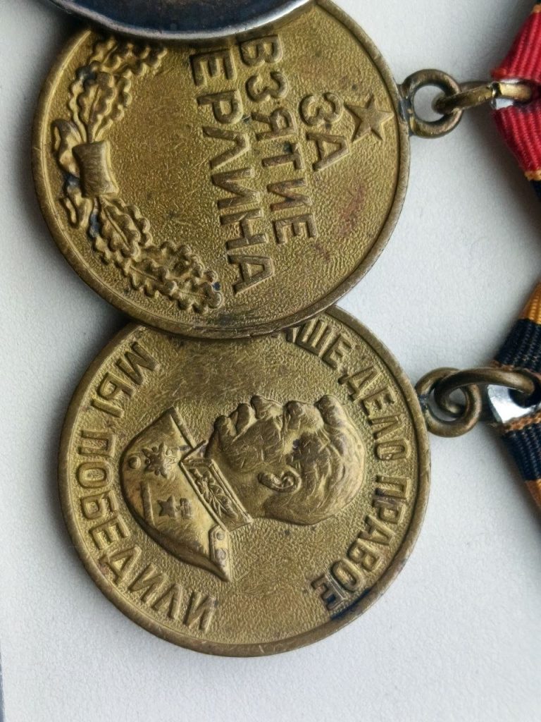 Группа наград, на одной колодке ; ЗА ОТВАГУ номер 103283 , ЗА ВЗЯТИЕ БЕРЛИНА, ЗА ПОБЕДУ НАД ГЕРМАНИЕЙ
