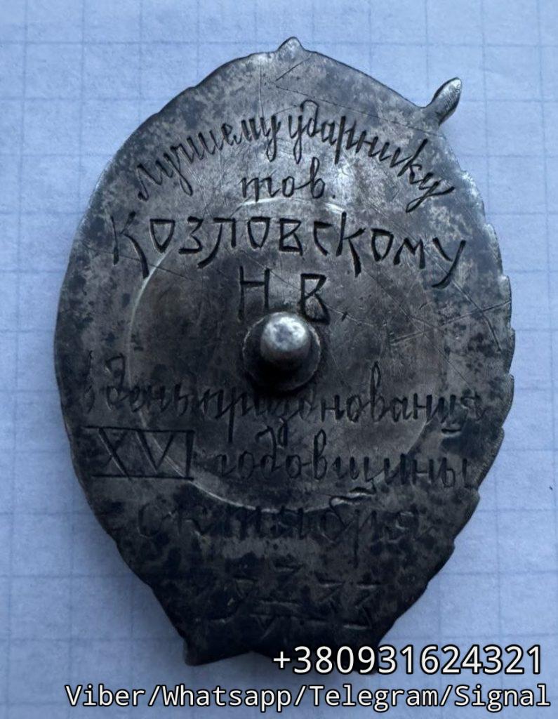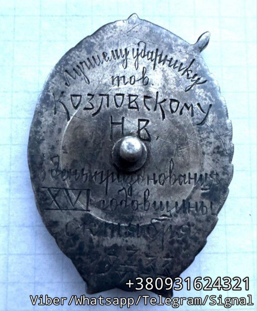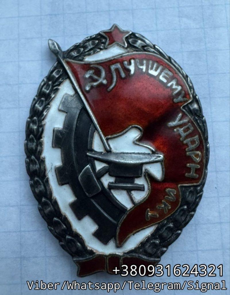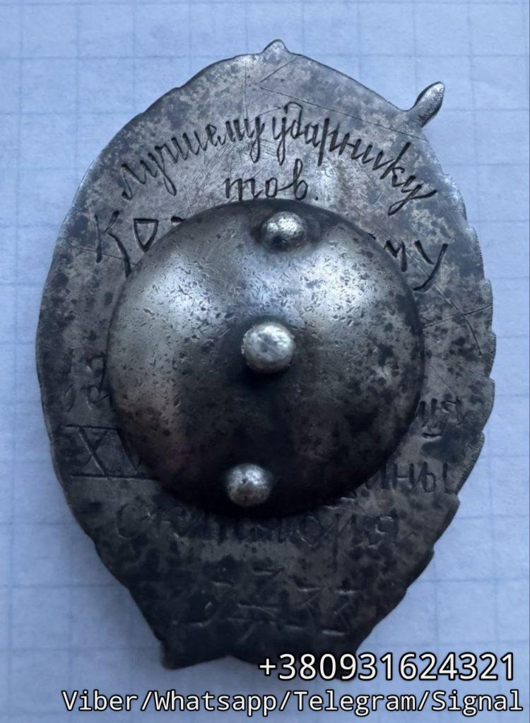 Знак , лучшему ударнику УССР 30 е годы, серебро , эмаль, винт